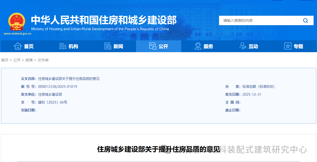 住房是人民群众美好生活的重要载体。为适应人民群众高品质居住需要,加快推进住房品质提升,住房城乡建设部发布关于提升住房品质的意见。加快推动建筑业与先进制造技术、新一代信息技术的深度融合,在更大范围推广智能建造、绿色建造、装配式装修。积极发展装配式装修,推广集成厨卫、架空地面、装配式隔墙等,缩短装修时间,方便更新维护。打通研发、设计、生产、施工、装修、运维、服务等产业链意见主要内容如下: