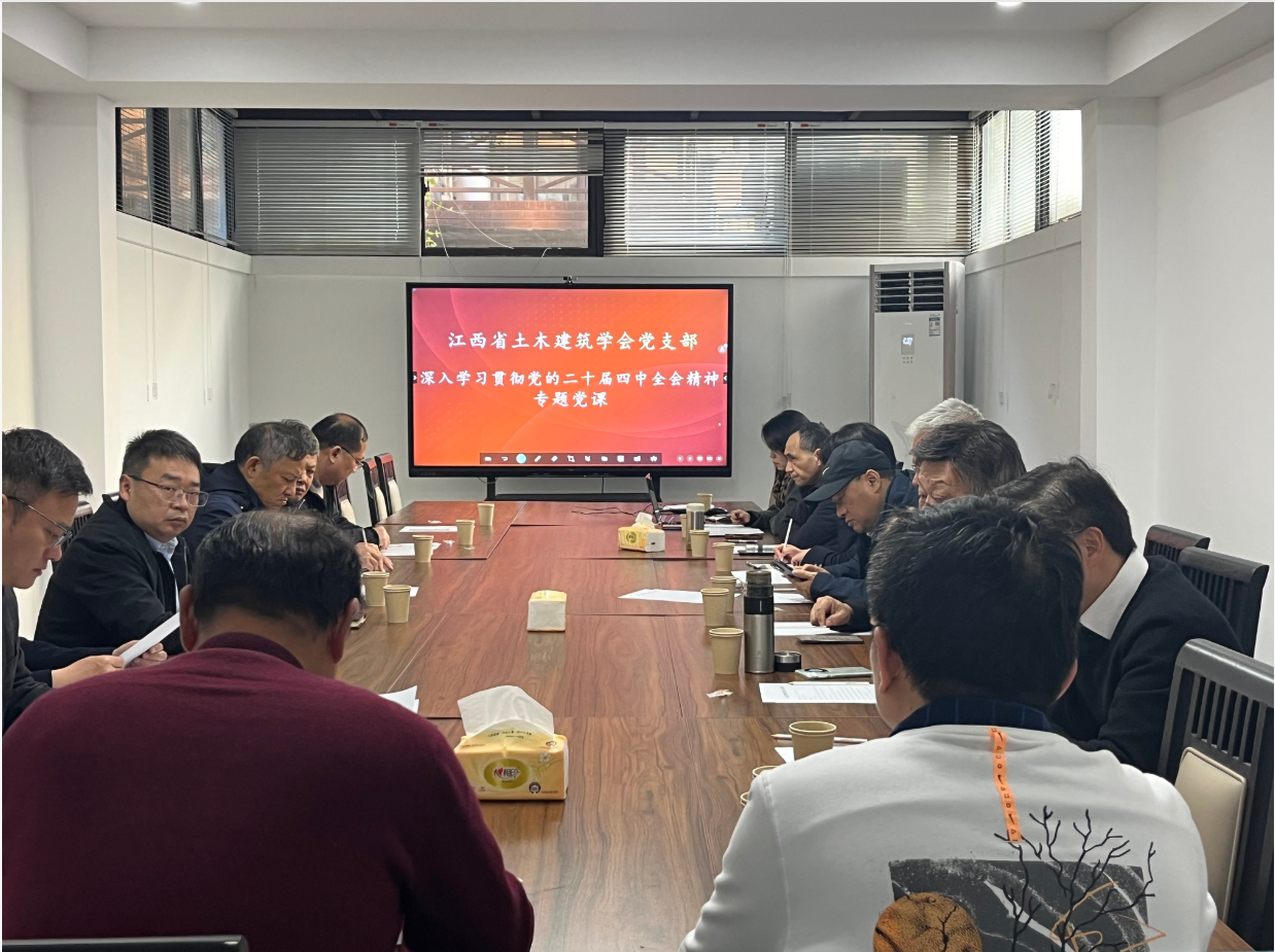为深入学习领会、全面准确把握党的二十届四中全会的重大意义、核心要义和实践要求,切实将全会精神转化为推动工作的强大动力,12月19日,江西省土木建筑学会(以下简称“学会”)党支部组织开展学习宣传贯彻党的二十届四中全会精神专题党课。本次党课由学会党支部书记、理事长许秋华同志主讲,学会领导班子成员、秘书处及部分党员代表参加了学习。